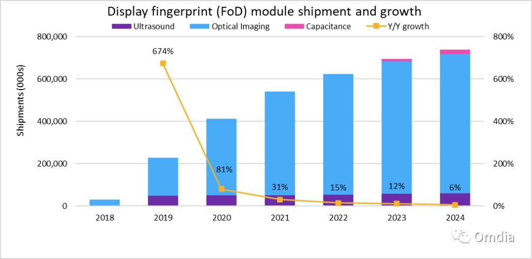 2019年全球屏幕指纹(FoD, fingerprint ondisplay)感测模组的出货量增长到了将近2018年的八倍;屏幕指纹传感器越来越多地用在中高端智能手机上,取代了传统以硅制程为基础的电容指纹芯片。根据Omdia的数据,2019年屏幕指纹感测模组的出货量是2.28亿个,比起2018年的2,950万个有了674% Y/Y的年增长。根据Omdia出版的《屏幕指纹(FoD)技术与市场报告– 2020》显示,随着屏幕指纹的技术成熟,模组价格也到了市场上可接受的甜蜜点,预计屏幕指纹模組于2020年的出货量,将继续会有显著的成长幅度,可望达到4亿个以上。